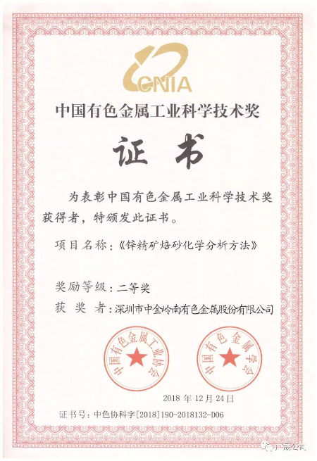 经中国有色金属工业协会、中国有色金属学会评审,由深圳市中金岭南有色金属股份有限公司参与制定、韶关冶炼厂负责完成的《矿冶痕量检测技术与标准研究及应用》《锌精矿焙砂化学分析方法》两个项目分别获得2018年中国有色金属工业科学技术一、二等奖。