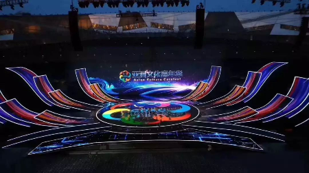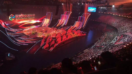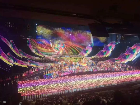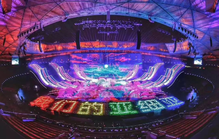 晚会现场,15000多平方米的主舞台焕彩多姿,尽情展示了亚洲各个国家、各个民族的迷人风采。超过10000平方米的LED显示屏绽放在鸟巢中央,时而如一朵巨大的牡丹花,盛开18朵花瓣,时而如系着云霞披风的孔雀, 煽动着壮硕的羽翎,可谓美轮美奂、万众瞩目。这一国家盛事的舞台显示由光祥科技打造,舞台“C位”的巨型主显示屏和鸟巢“C位”的超炫“花瓣状”显示屏均由国星RGB事业部的1921户外显示器件华丽打造。