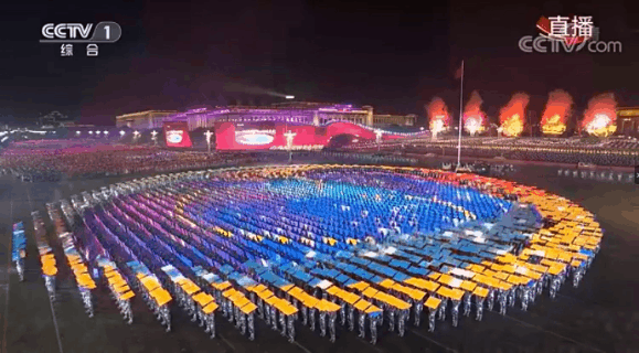 3000多名联欢群众演员跟着音乐的旋律,流动着拼组出“巍峨的长城”“飘曳的风筝”“展翅的和平鸽”“飘动的五星红旗”等令人叹为观止的主题巨幅动图,象征着全国人民携手共筑中国梦的美好寓意。