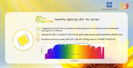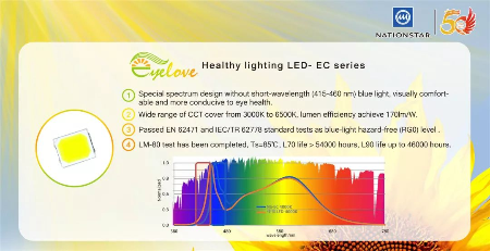 Eyelove™ LED,从光源本质上降低普通光源带来的短波蓝光损伤,减少视觉疲劳,同时,结合活动场景,适宜地调整光谱,保护眼睛、提高视觉舒适度。Eyelove™自然光DL系列主打类太阳光谱,减少了低波段蓝光(415-460 nm)部分,可为更高标准的灯具提供更有优势的光动力。Eyelove™健康光EC系列,主打降低短波蓝光护眼功能,视觉舒适度高,更有利于眼睛健康,色温覆盖3000K-6500K,系列齐全,4014系列光效高达180lm/W。