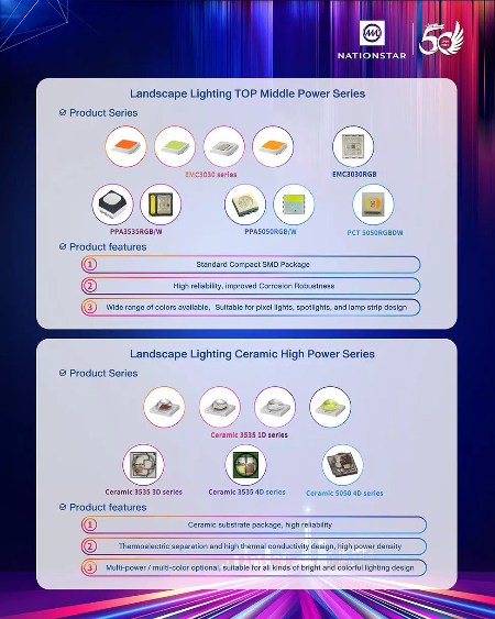 伴随着城市化进程不断深化、城市设施不断升级,文旅灯光、夜游经济、特色小镇建设热潮逐渐兴起,同时受益于全球各个国家或地区政策推广支持,景观亮化市场渗透率不断提高。近年来,国星光电积极布局景观照明细分领域,全面打磨从中低功率到高功率,从单色、白光到全彩,全功率、全色系、全平台系列化景观亮化LED产品,为客户提供全场景一站式LED器件解决方案。