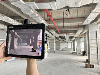 为适应机场区域施工环境,项目团队利用塔吊平台的无人机进行倾斜摄影,动态优化施工场地布局,并运用新型技术工具开展室内数字化AR质量验评,有力保障工程创优质量。