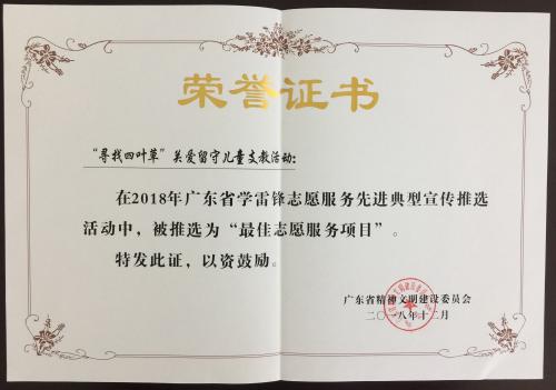 近日,能源集团下属天一电厂“寻找四叶草”关爱留守儿童支教活动在2018年广东省学雷锋志愿服务先进典型宣传推选活动中,被评选为“最佳志愿服务项目”。
