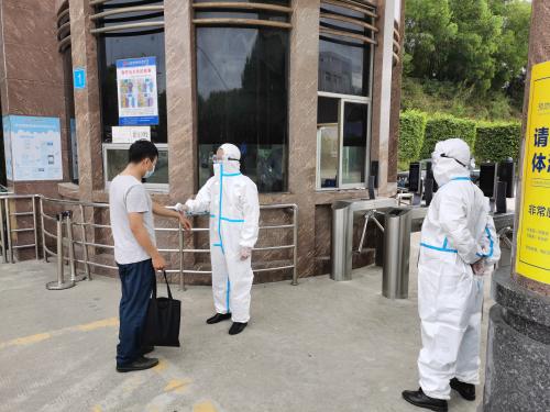 演练模拟一名外来人员在大门岗入厂测温时,被发现体温高于37.5摄氏度,为发热疑似病例,保安人员将其带至单独隔离室,并将情况报告疫情防控应急协调员。应急协调员马上将掌握的情况汇报应急总指挥,总指挥要求立即启动公司疫情防控应急预案。随后,应急指挥部组织对门岗和隔离区域进行消毒、隔离,并将情况汇报至地方防疫部门和上级单位。最后,地方防疫部门工作人员到达现场,将疑似病例转运收治,演练结束。