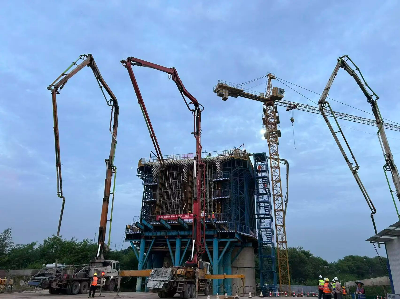 此次浇筑的0号块位于罗定江特大桥55号主墩,该连续梁桥共360米,为深南高铁最大跨度连续梁桥,采用托架法施工,侧模及底模采用定型钢模板,高度为11米,设计方量为1470立方米,一次性浇筑成型。