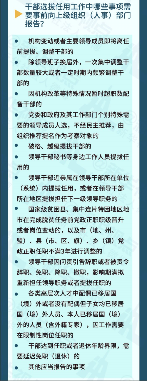 第十七条 在干部选拔任用工作中,有下列情形之一,应当在事前向上级组织(人事)部门报告: