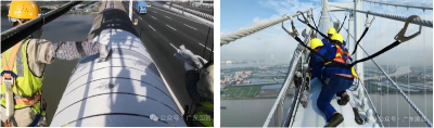 创新技术成果:高硅氧气凝胶毡在南沙大桥缆索防火性能提升上的应用(左图)、超高延性混凝土材料在博深高速伸缩缝维修上的应用(右图)