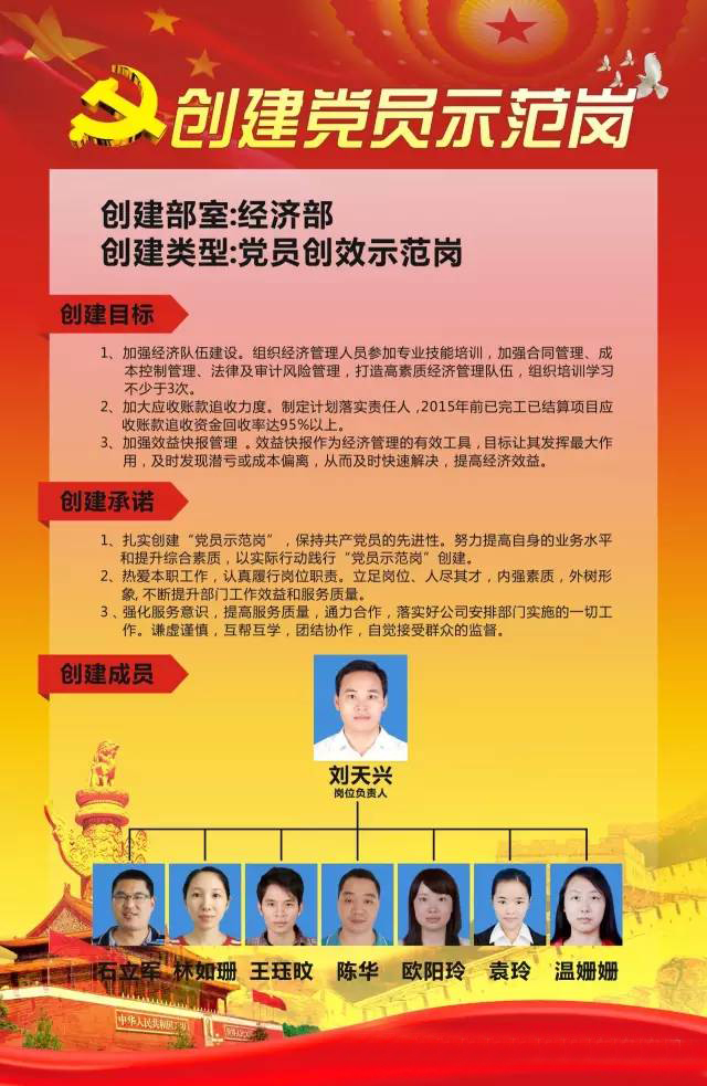 “党员创效示范岗”的创建紧密结合公司经济部工作实际,让党员把自己身份亮出来,促进部门员工素质的稳步提高,努力开创公司经济管理工作新局面。