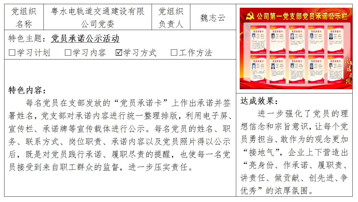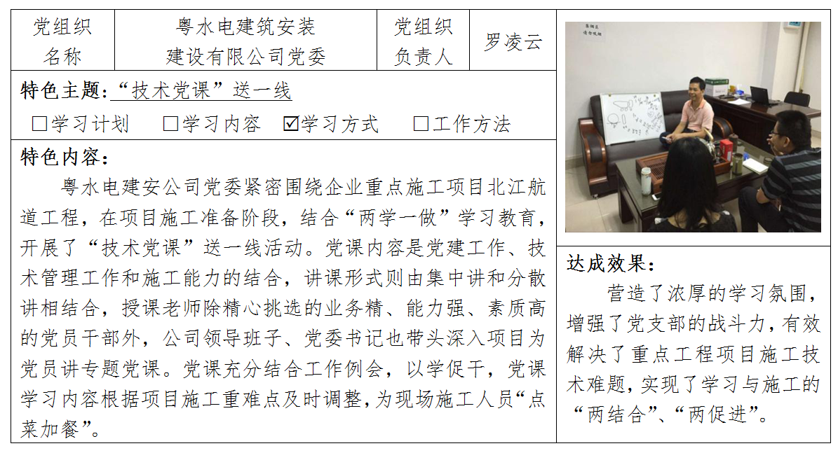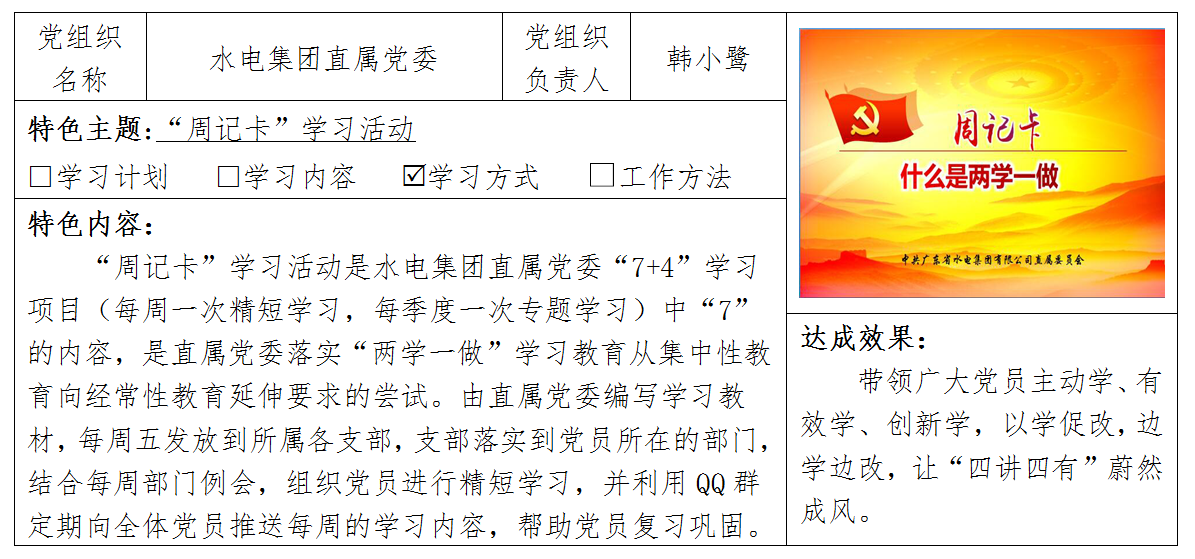 为实现与宣传引导的鲜活碰撞,针对“两学一做”学习教育的“一支部一特色”,水电集团精心组织,指导每一个党支部将各自的特色做法设计成一张张宣传名片,通过汇编、多媒体刊发的方式,进一步深化宣传交流,增强基层党组织对广大党员的吸引力和凝聚力,营造了浓厚氛围。