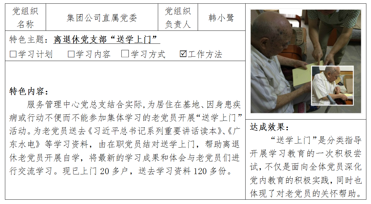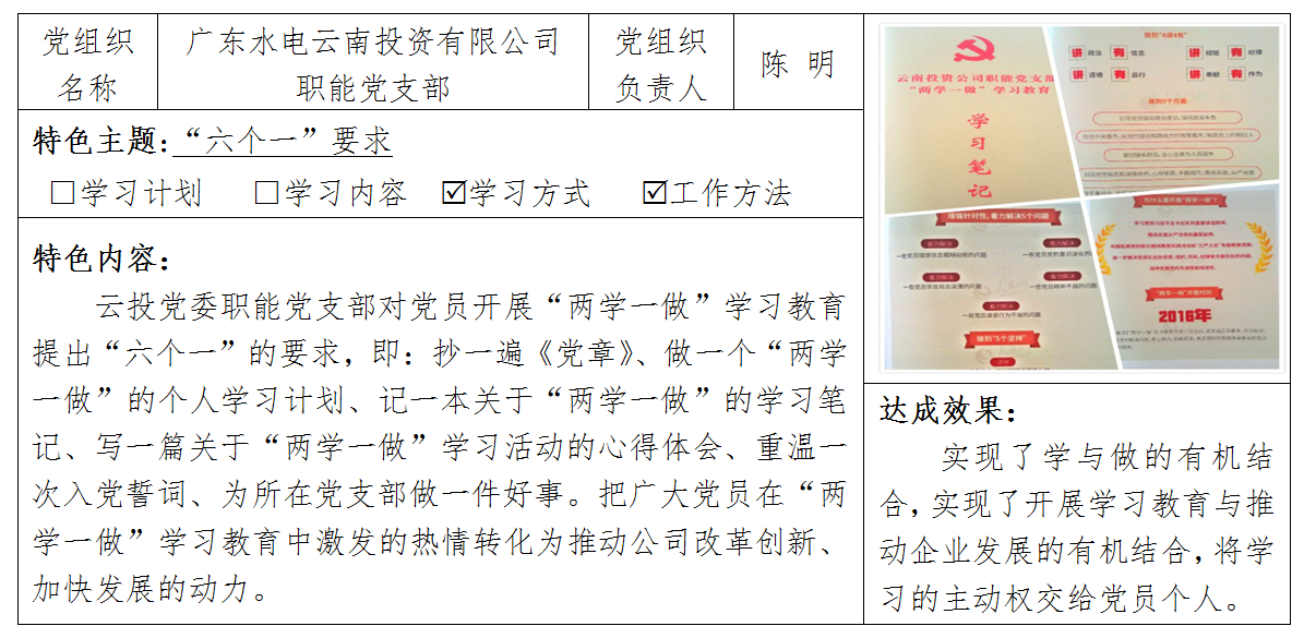 “一支部一特色”,是水电集团为鼓励基层党组织立足实际,探索创新,激发党建工作活力的重要载体。“两学一做”学习教育中,水电集团所属各级党组织从内容形式、组织领导等方面切入,针对不同环节形成一个或多个亮点特色,形成支部的特色做法,既是对“两学一做”学习教育“全面覆盖、分类引导”部署要求的贯彻落实,也是对“一组织一特色”的深度延伸。