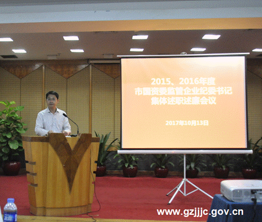10月13日,广州市国资委组织召开2015、2016年度市国资委监管企业纪委书记集体述职述廉会议,对各企业纪委书记进行工作考评。会议由广州市国资委副主任覃海宁主持。