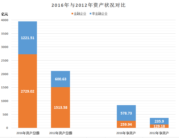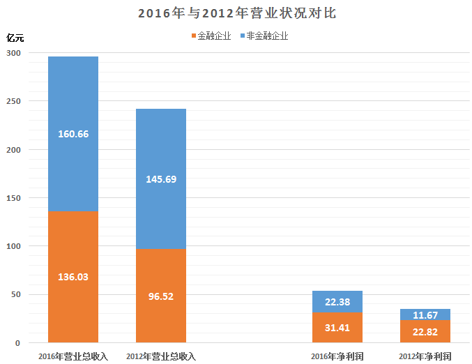 2016年末,我市市属国有企业资产总额达3951亿元,较2012年末2114亿元增长87%;净资产839亿元,较2012年末365亿增长130%;资产负债率为78.77%,较2012年末82.73%下降了4个百分点(其中非金融企业资产负债率为52.54%,较2012年末60.72%下降了8.18%)。2016年我市市属国有企业实现营业总收入297亿元,较2012年242亿元增长22%,约占全省营业总收入的2.9%;实现利润总额67亿元,较2012年46亿元增长47%;实现净利润54亿元,较2012年34亿元增长56%。