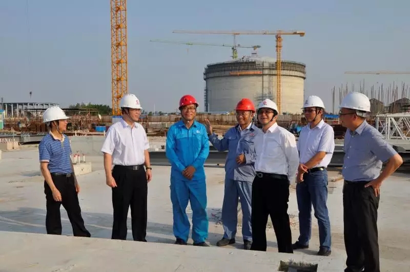 在大型低温储罐施工现场,李成主任与现场施工单位负责人进行了亲切的交谈,详细了解现场施工情况及存在困难,感谢施工单位为项目建设作出的贡献,鼓励施工单位再接再厉继续做好项目建设施工管理工作,要求“施工再忙、安全不忘”。