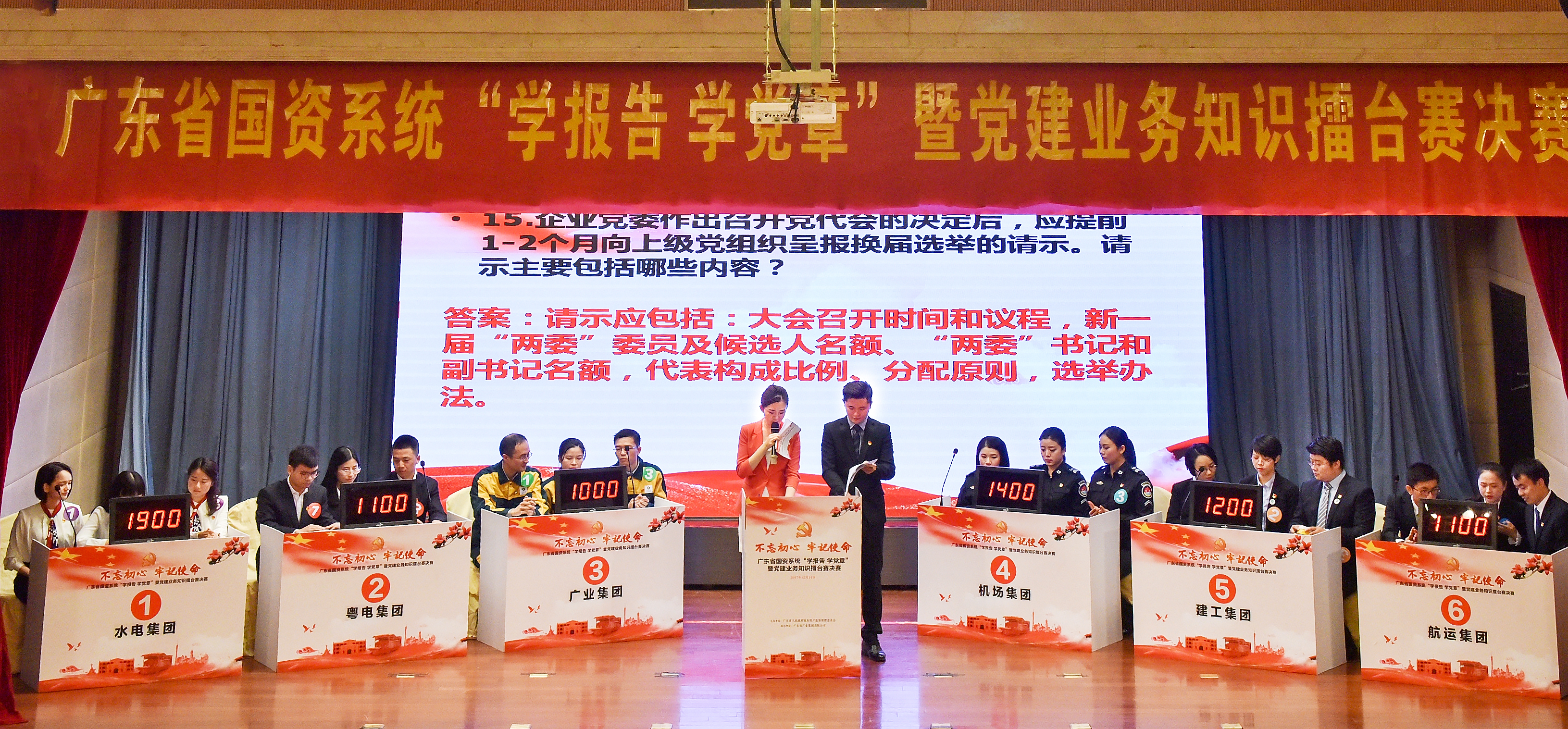 今年8月,平博888 党委联合南方报业传媒集团“南方+”客户端,举办了“国企党建网络知识竞答暨党建业务知识擂台赛初赛”。综合各省属企业参赛率、满分率和平均得分,机场集团、广业集团、粤电集团、航运集团、建工集团、水电集团等六支队伍进入今天的决赛。这次决赛以“不忘初心、牢记使命”为主题,主要围绕党的十九大精神,全国、全省国企党建工作会议精神,党章党规和党建业务知识开展。