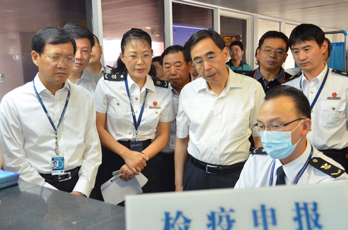 朱小丹首先来到重点航班专用检验检疫查验通道,详细查看了检验检疫部门对来自埃博拉疫情发生地旅客的检疫查验流程,以及在可疑病例处置中联防联控机制的运作情况。他特别询问了检验检疫部门通过信息填报对旅客进行信息采集和筛查的情况,了解机场配合检验检疫部门对重点查验区实施“三区两通道”改造工程的进展。广州机场检验检疫局负责人对此进行了详细解答和情况介绍,并重点汇报了广州机场检验检疫局实施三个提前、三个再造、三个集中的埃博拉防控新模式,以及与机场、边检、公安、海关等部门开展联防联控的情况。