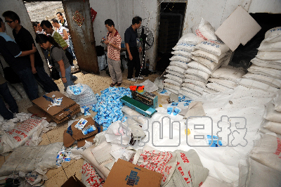 在接到群众举报称南海区大沥谢边村委的瓜步汛村附近可能存在假冒食盐的生产窝点后,佛山盐务局随即联合公安、经贸等职能部门进行调查取证,摸清该制假窝点位于瓜步汛村一组偏僻厂房处。经周密部署,9月24日下午3时佛山盐务局、公安、经贸等多个执法部门职联合采取行动,成功捣毁该窝点,当场查获假冒500克纸塑精盐2吨,假冒500克复合膜精盐8吨,50公斤装工业盐10吨,假冒纸塑精盐纸箱960个,纸塑片膜袋30卷。同时查扣满载假冒成品小包装食盐的湖南牌号货车一辆,及收缴缝口机、包装机等制假工具一批。