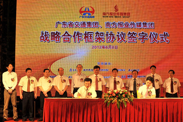 6月8日上午,广东省交通集团、南方报业传媒集团在广州举行签字仪式,双方共同签署了战略合作框架性协议。两集团强强联手,是双方自身发展的需要,是省属国有企业贯彻落实省第十一次党代会有关深化国有企业改革精神的一次有益尝试,同时也为大型交通骨干企业与主流媒体深度合作开创了一条可行之路。