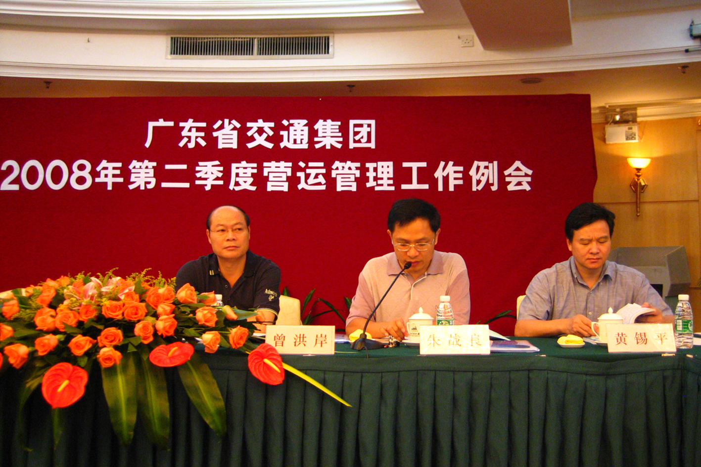 2008年7月29日,省交通集团在珠海市召开2008年第二季度高速公路营运管理工作例会。会议总结了上半年高速公路营运工作情况,部署了下半年营运管理主要工作,并交流了关于打击盗用伪造军车号牌专项斗争工作和“绿色通道”规范管理的经验,研讨了极端化环境下(冰雪、大雾、洪水、台风、地震、桥梁等重大事故)高速公路营运管理应急预案。集团曾洪岸副总经理作会议总结,对各单位上半年工作所取得的成绩给予了肯定,对下一步做好营运管理工作提出了具体要求。