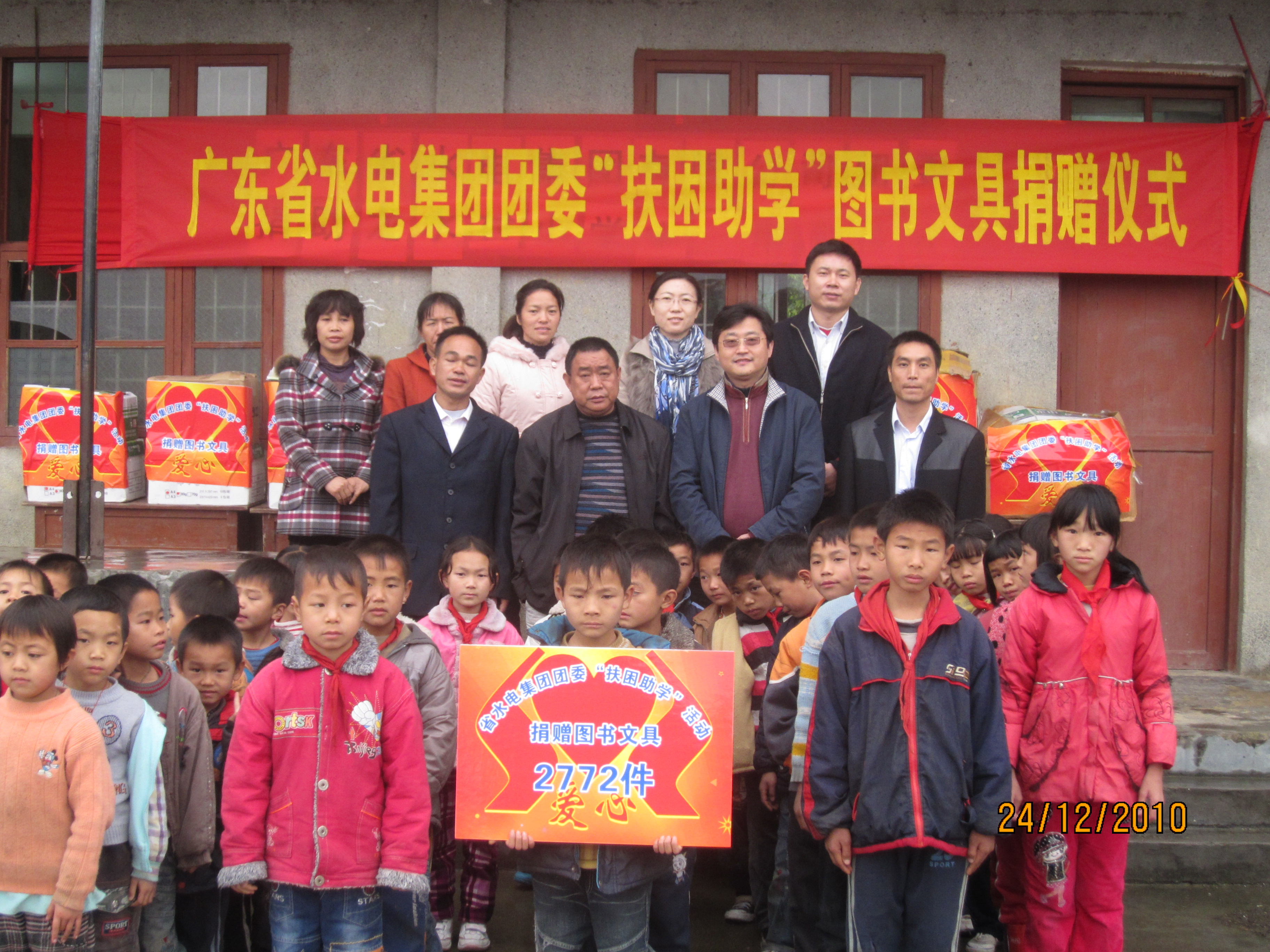 12月24日,省水电集团在“双到”工作定点扶贫村连南县香坪镇龙水村移民小学组织了“扶贫助学”图书文具捐赠仪式,集团党委副书记华正亭代表集团将集团团员青年捐赠的2772件图书及学习用品送到孩子们的手中。集团人力资源部、政工部、团委负责人参加了捐赠仪式。