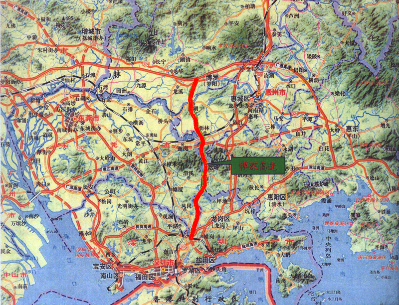 博深高速公路是省高速公路网规划“九纵五横两环”中的第四纵线深圳至湖南汝城高速公路的重要组成部分,2008年被列入“新十项工程”。项目跨惠州、东莞、深圳3个城市,全长63.2公里,概算总投资85.94亿元。项目起于惠州市博罗县罗阳镇,止于深圳市龙岗区排榜互通立交,与盐排高速公路相接。全线采用双向六车道高速公路标准设计,设计行车速度为100公里/小时。本项目计划2012年底建成通车。