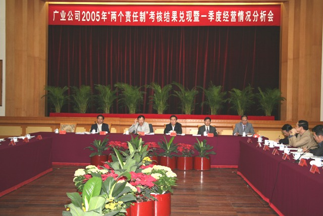 4月17日,我公司在广州珠岛宾馆召开2005年“两个责任制”考核结果兑现暨一季度经营情况分析会。会议由聂周荣副总经理主持,公司领导,各一级企业董事长、党委书记、总经理、纪委书记、分管经营和财务的副总经理及一名职能部门负责人,有关重点企业主要负责人,本部各部室主要负责人及下派财务总监、监事会主席近130人参加会议。