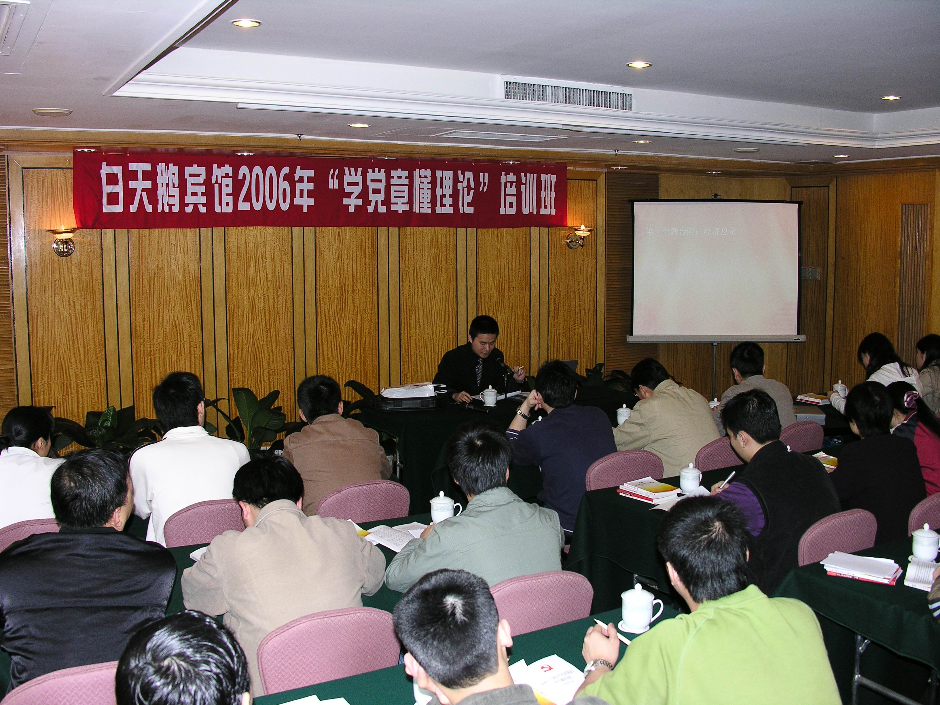 宾馆党委对“学党章懂理论”培训班进行了精心安排,明确目标任务,突出主题思想,创新方式方法。提出学党章要做到“五个结合”——与学习领会党的十六届五中全会精神结合起来,与反腐倡廉教育结合起来,与学习《共产党员先进性三字歌》结合起来,与提高党员身体素质结合起来,与实施品牌发展战略结合起来。邀请省委讲师团的专家作党的十六届五中全会《建议》、新党章的学习辅导讲座;全体学唱《四大纪律八项要求》、《入党申请书》等教育歌曲;邀请暨南大学的教授讲授有关酒店执行力与精细化管理的课程;邀请省妇幼保健院的主任医生讲授亚健康预防知识。力求全方位、多层次提升党员的综合素质,适应新时期的形势发展,永葆先进性。