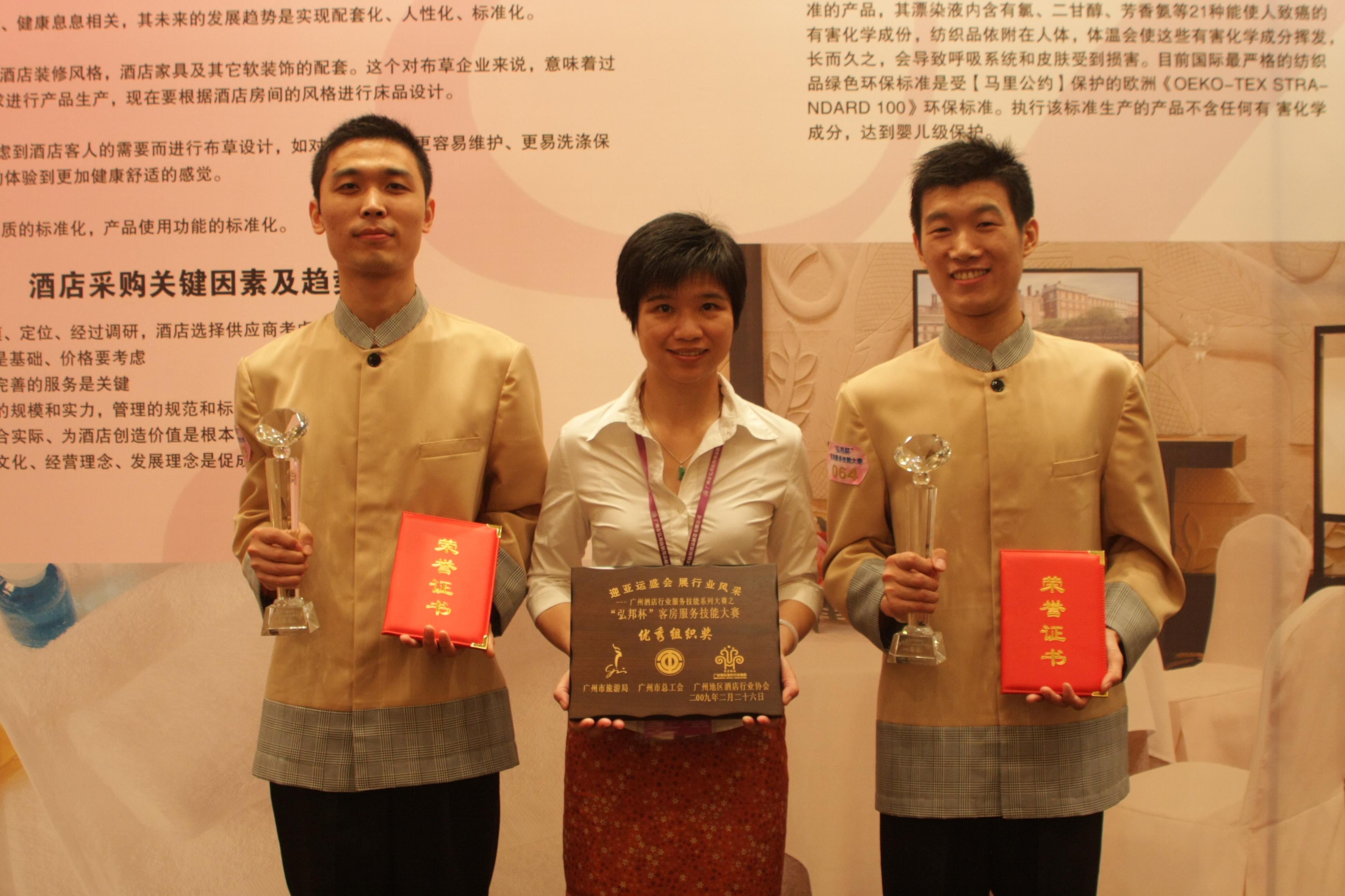 日前,由广州市旅游局、广州市总工会主办,广州地区酒店行业协会承办的“迎亚运盛会展行业风采”——广州酒店行业服务技能系列大赛之“弘邦杯”客房服务技能大赛隆重举行,来自58个星级酒店的112名选手参加了本次大赛,近600名业内同行参与了观摩交流,经过激烈角逐,白天鹅宾馆派出的两名参赛选手甄作令、胡奔发挥出色,力挫群雄,双双荣获一等奖。