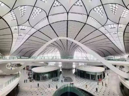 北京大兴国际机场的建筑主体采用五指廊的造型,形如展翅的凤凰,被誉为“金凤凰”,凭颜值高、规模大、有智慧、超便利被英国《卫报》评为“新世界七大奇迹”之首。