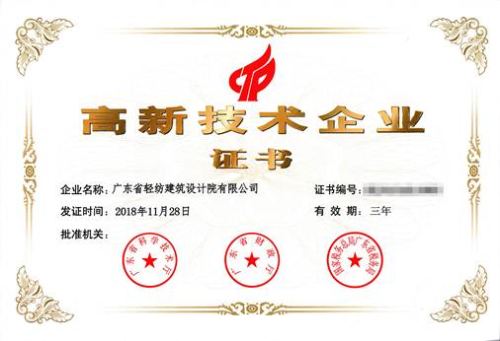 近日,广业集团下属广东省轻纺建筑设计院有限公司(下称“轻纺院”)获得由省科学技术厅、省财政厅、国家税务总局、省税务局联合颁发的国家级“高新技术企业证书”。这一证书的获得,既是对轻纺院整体技术水平的肯定和认可,也是对轻纺院创新工作的鼓励和支持,标志着轻纺院的技术研发能力迈上新的台阶。