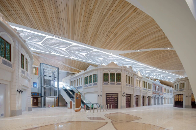 在设计实现上,省建院创新实现复杂花冠柱结构与超大跨度钢屋盖的混合体系,助力打造全国首个连续着色焊接不锈钢屋面航站楼,结合多项智慧运营技术,使装修设计巧妙融合国际风范、中国韵味和岭南特色,打造出“高效温情、智慧人性”的出行体验,使机场从“乘机中转站”蜕变为引人入胜的“好玩目的地”。