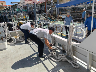 甲板上的船员在烈日下坚守岗位,为开航做准备