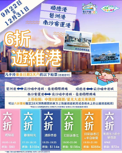 从9月22日至12月31日,凡持距出发3日内的有效跨境船票(包括琶洲港、南沙客运港往返尖沙咀中港城或香港国际机场的航班,以及顺德港往返尖沙咀中港城航班的船票),即可在香港“东方之珠”维港游或“香港水上的士”售票处以6折优惠购买28天内的维港游航班,最低仅需60港元。