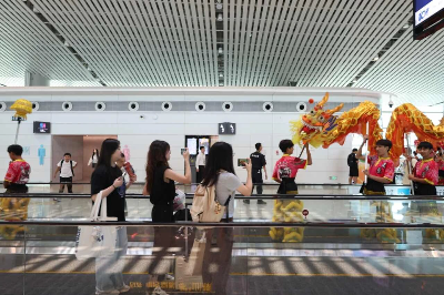 国庆当天,揭阳潮汕机场在航站楼举办舞龙快闪活动