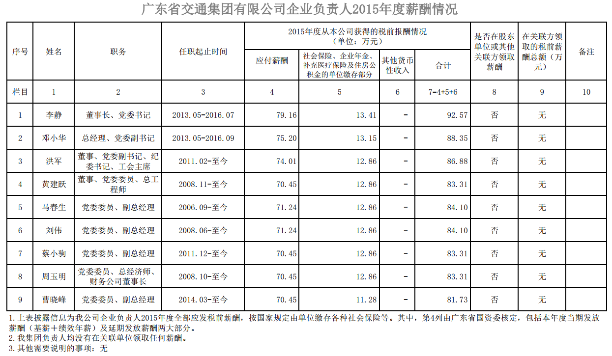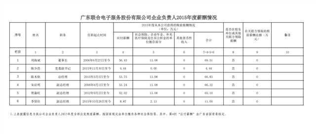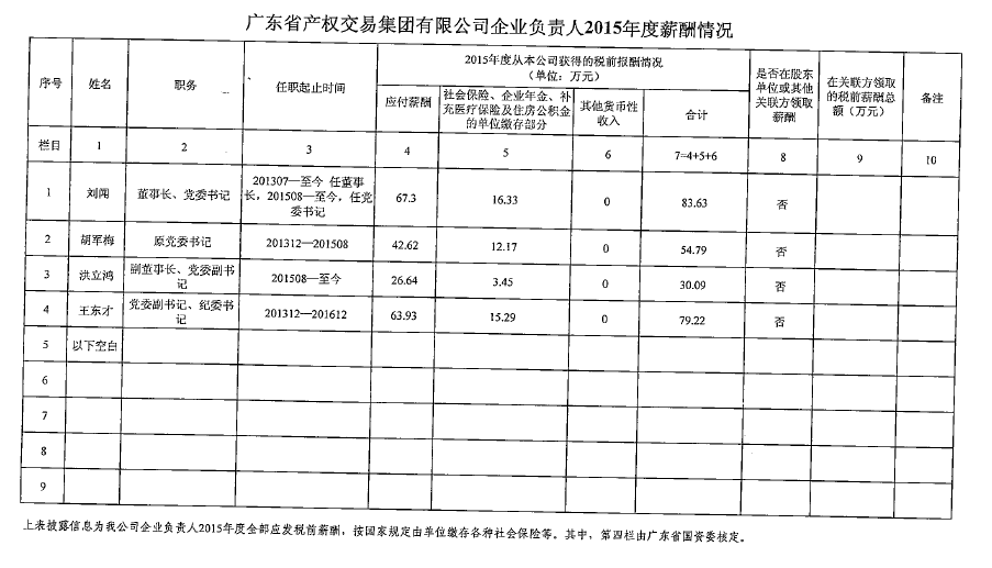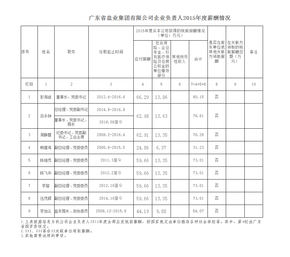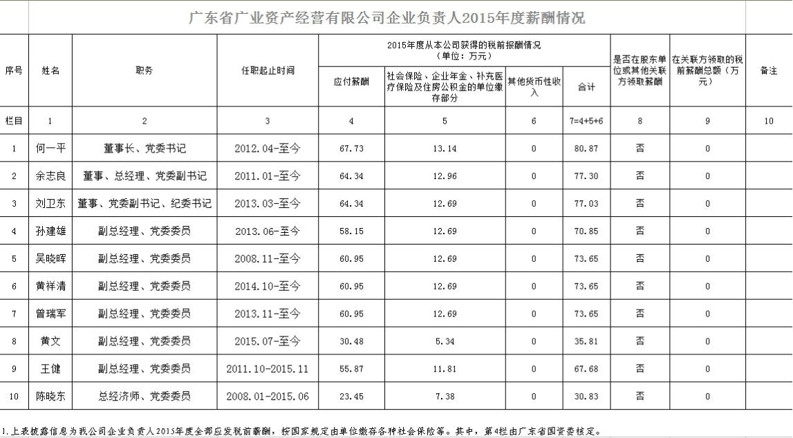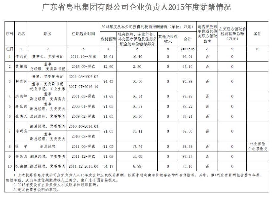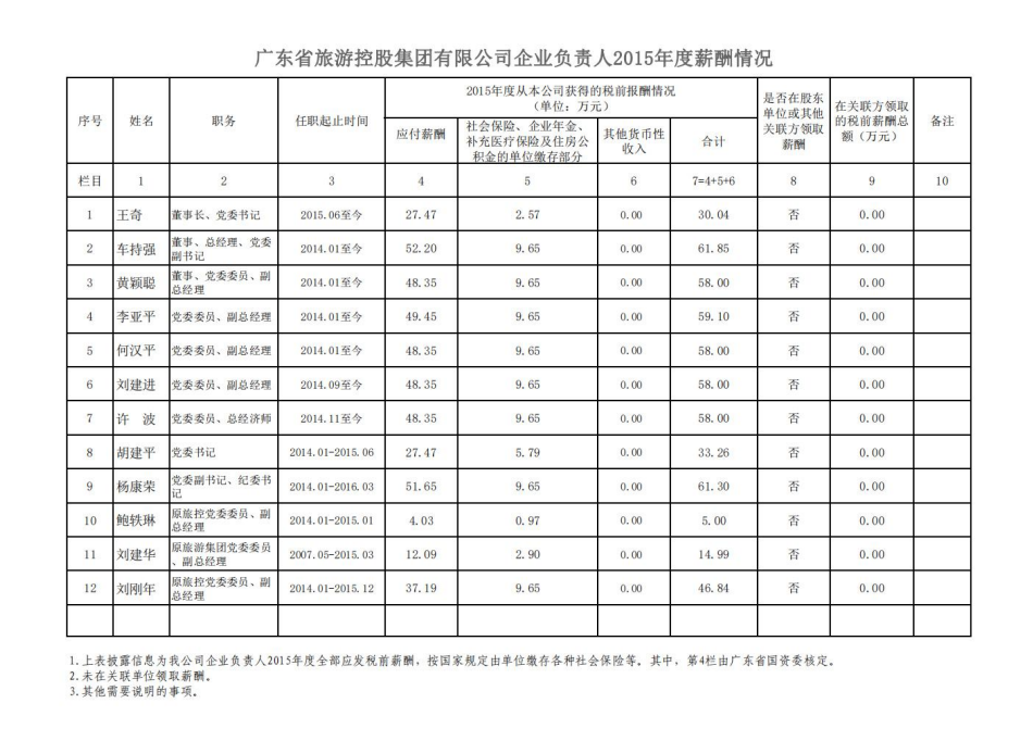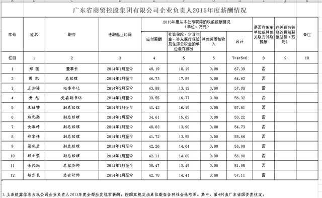 监管企业负责人2015年度薪酬情况