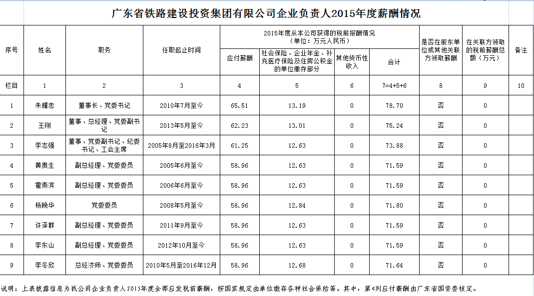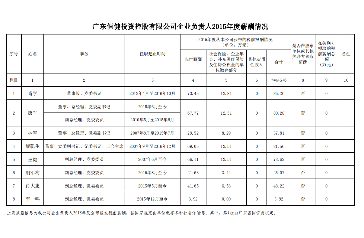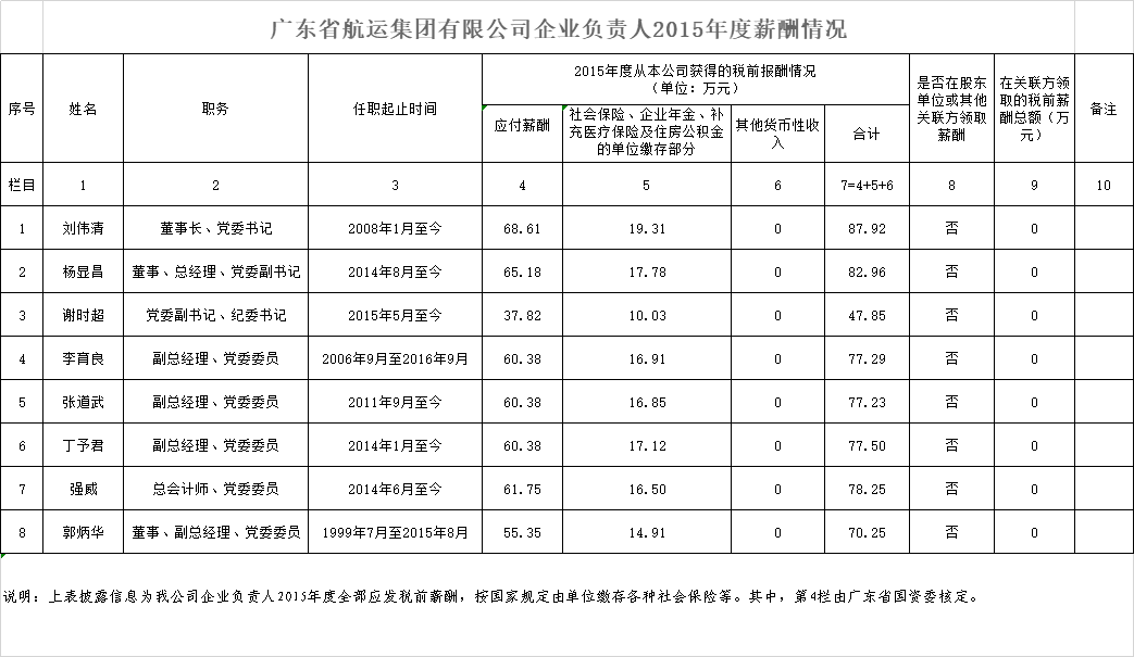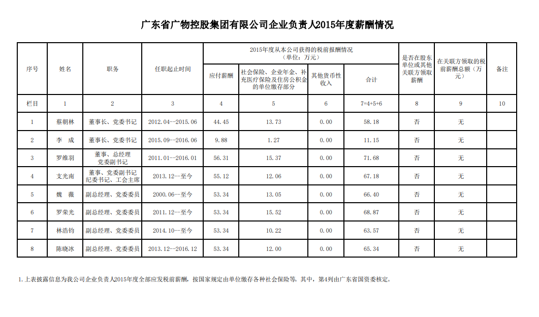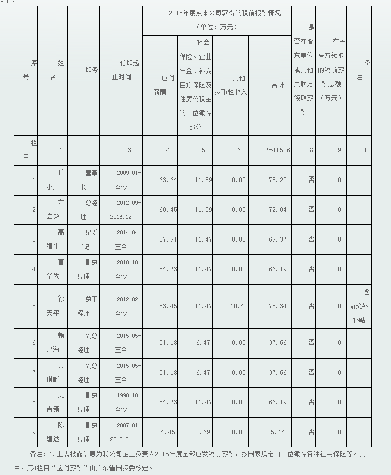 监管企业负责人2015年度薪酬情况