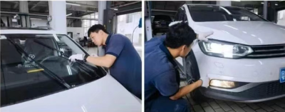 维修师傅在进行车辆雨刮器、灯光系统检查