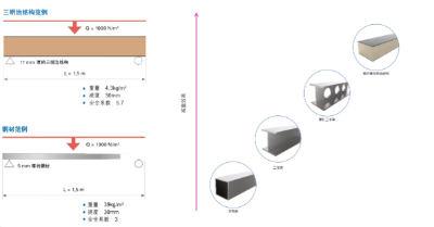 在受力相同情况下,碳纤维三明治结构对比传统钢材减重大于70%