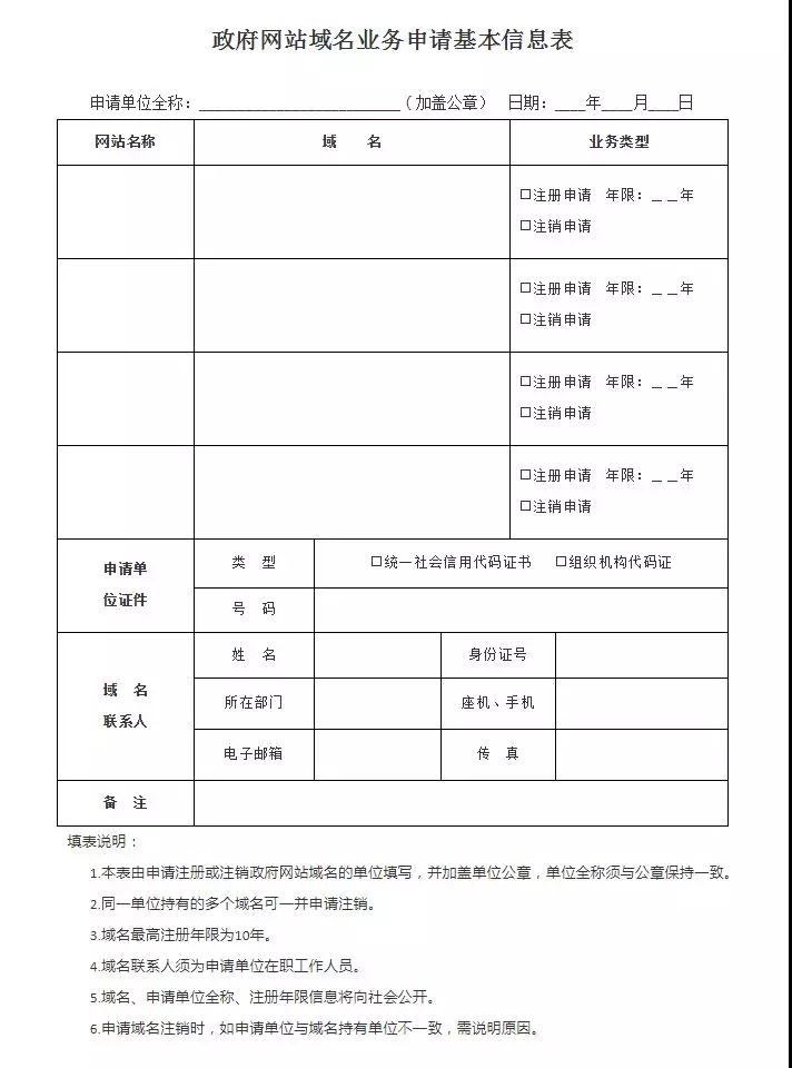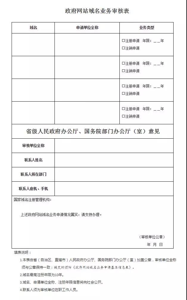 (一)严格政府门户网站域名注册、注销审核。省级人民政府和国务院部门注册或注销政府门户网站域名,要经本地区、本部门主要负责人同意后,报国务院办公厅备案,并向国家域名注册管理机构提交政府网站域名业务申请基本信息表,“.gov.cn”英文域名的注册管理机构为中央网信办中国互联网络信息中心,“.政务”中文域名的注册管理机构为中央编办政务和公益机构域名注册管理中心。地市级、县级人民政府注册或注销政府门户网站域名,要经本地区主要负责人同意后,向上一级人民政府办公厅(室)提交政府网站域名业务申请基本信息表,逐级审核后,由省级人民政府办公厅向国家域名注册管理机构提交政府网站域名业务审核表。国家域名注册管理机构依法依规对信息进行核验,核验通过后3个工作日内完成注册或注销工作。