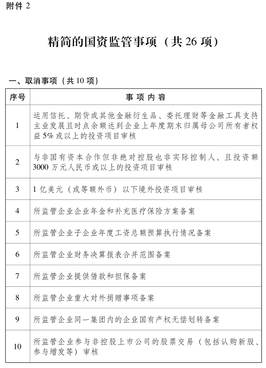 严格按照管理权限界定监管范围。参照国务院国资委“两个办法”、“两个清单”的管理模式调整优化所监管企业投资项目管理,将目前实行的对限额以上投资项目的审核管理转变为负面清单管理,明确出资人投资监管底线,划定监管企业投资行为红线,取消4类投资项目审核。减少薪酬管理事项,取消监管企业年金和补充医疗保险方案、子企业年度工资总额预算执行情况备案,推动建立市场化薪酬管理大数据系统,提升监管的精准性和科学性。优化监管模式,减少财务管理事项,取消所监管企业财务决算报表合并范围、提供借款和担保、重大对外捐赠事项等备案事项,加强检查和监督问责。减少产权管理审批事项,加大服务协调功能,取消所监管企业同一集团内的企业国有产权无偿划转备案,由企业依法自主决策。
